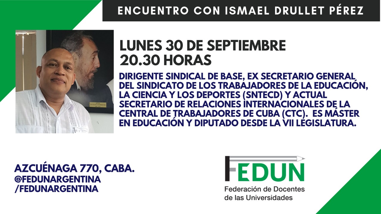 Los invitamos al encuentro con Ismael Drullet Pérez, dirigente sindical de base, ex Secretario General de los Trabajadores de la Educación, la Ciencia y los Deportes (SNTECD) y actual Secretario de Relaciones Internacionales de la Central de Trabajadores de Cuba (CTC). Es Máster en Educación y diputado desde la VII Legislatura.