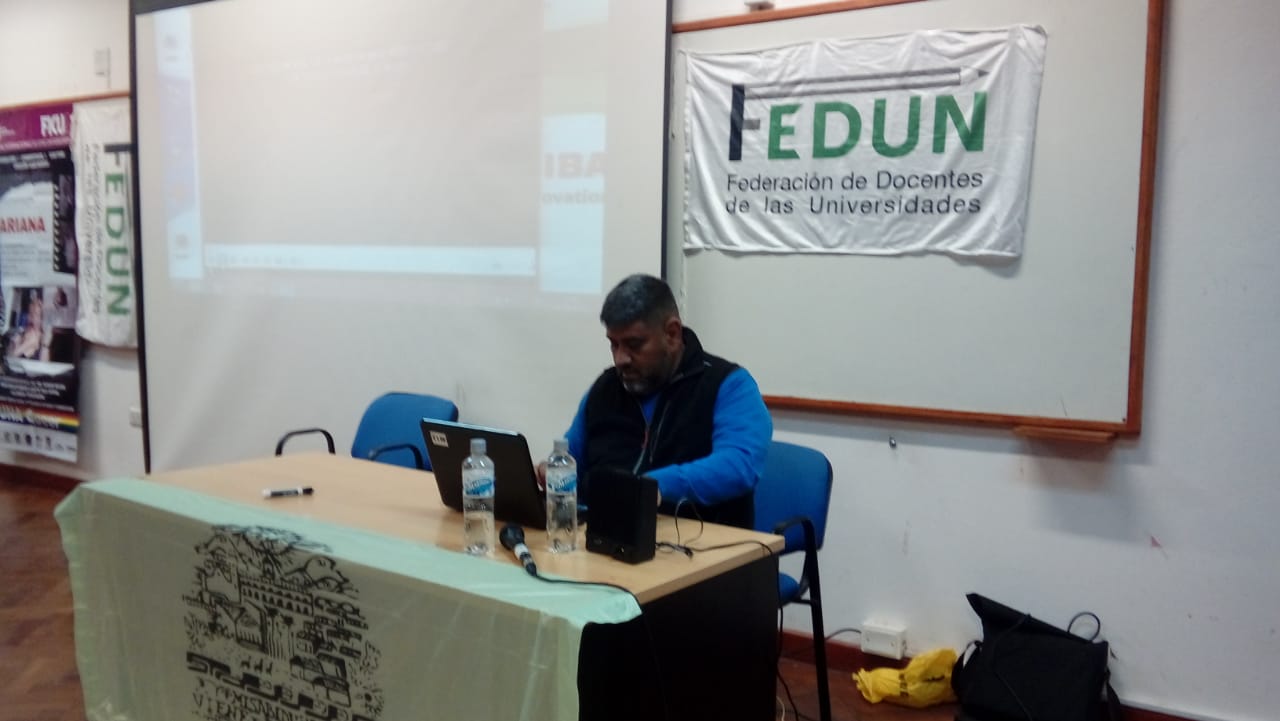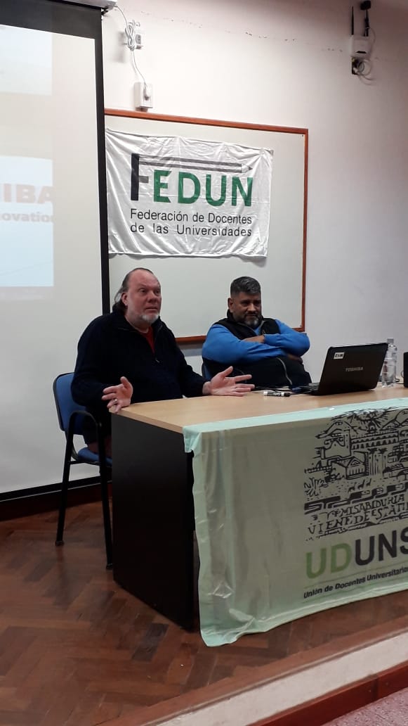 El secretario general de UDUNSa, Felipe Lescano, junto a Gabriel Rugiero, director de los documentales y profesor en la Universidad Nacional de las Artes, fueron los encargados de presentar el material ante alumnos de la universidad y público general.